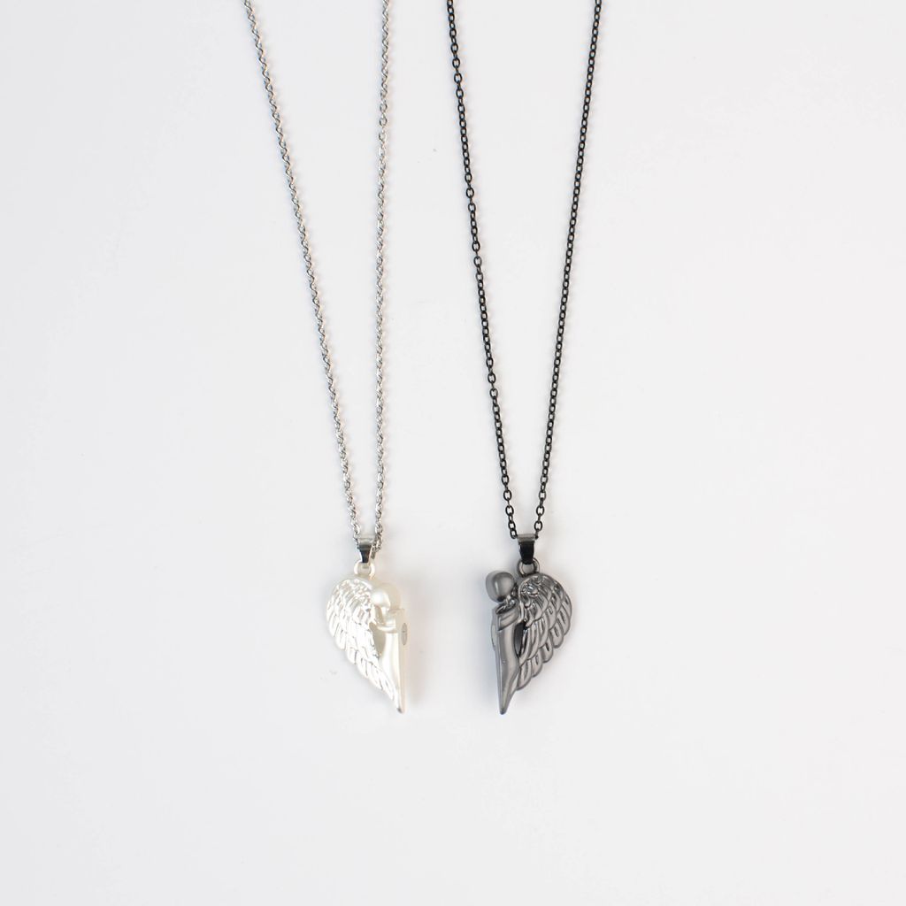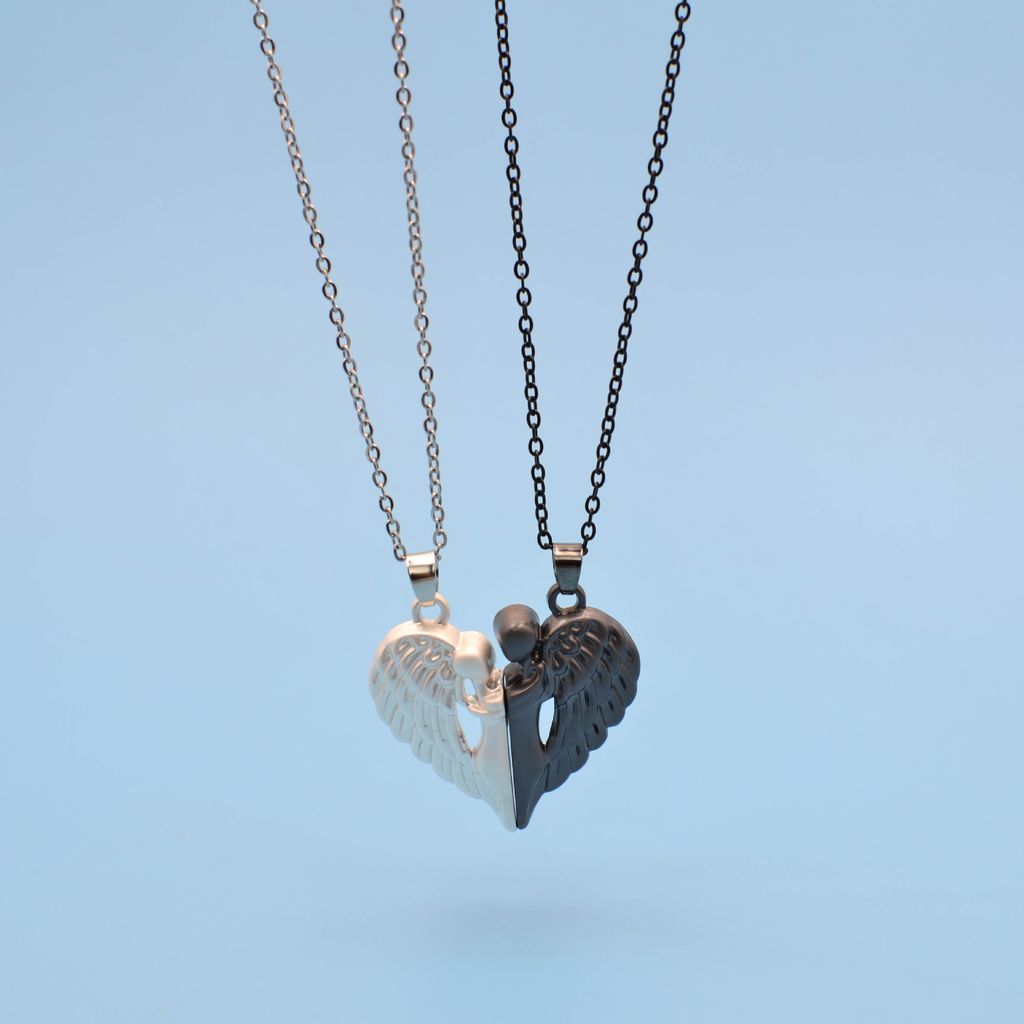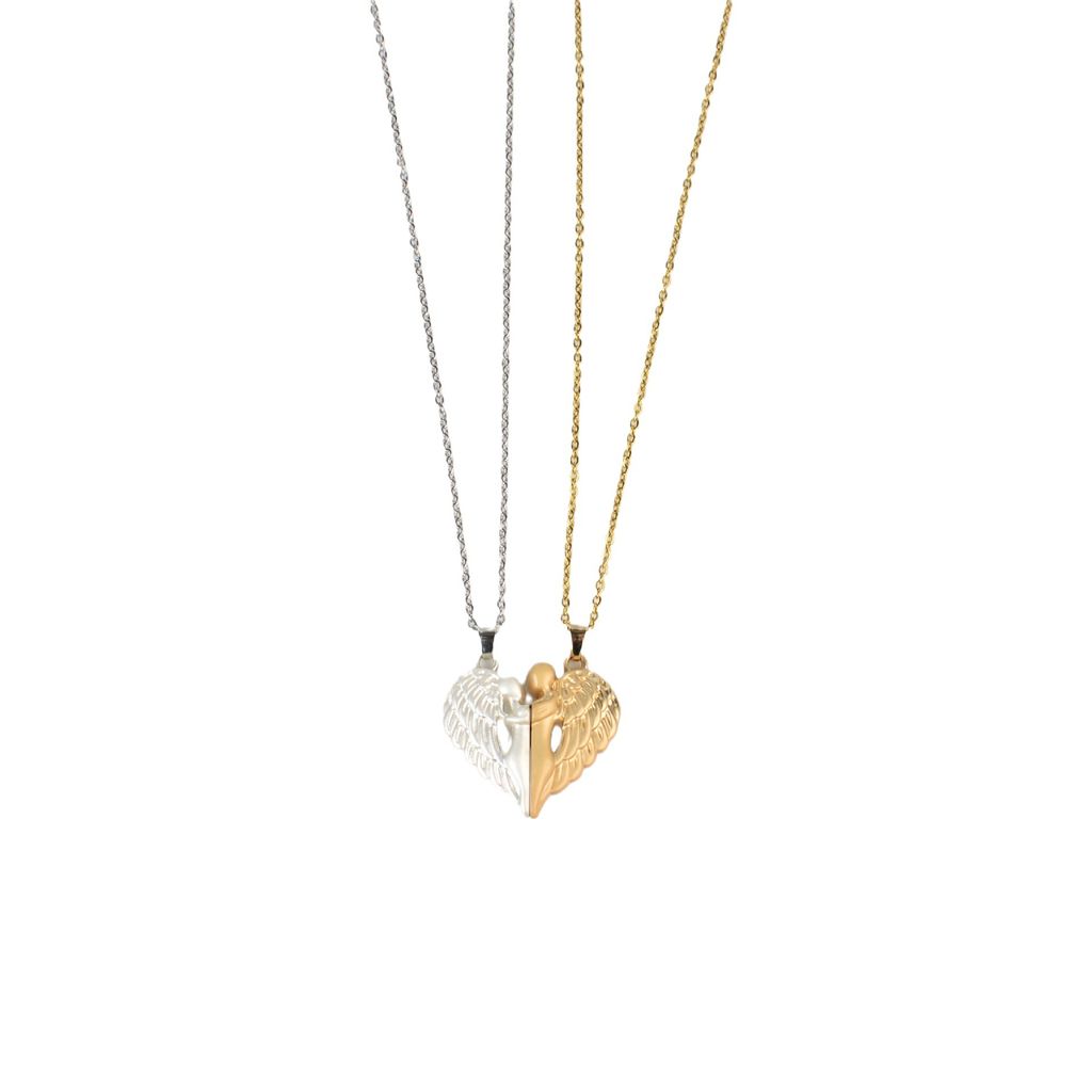 MATCHING SET DESIGN: Two separate necklaces featuring angel wing pendants that form a complete heart when brought together, symbolizing unity and connection between couples or best friends