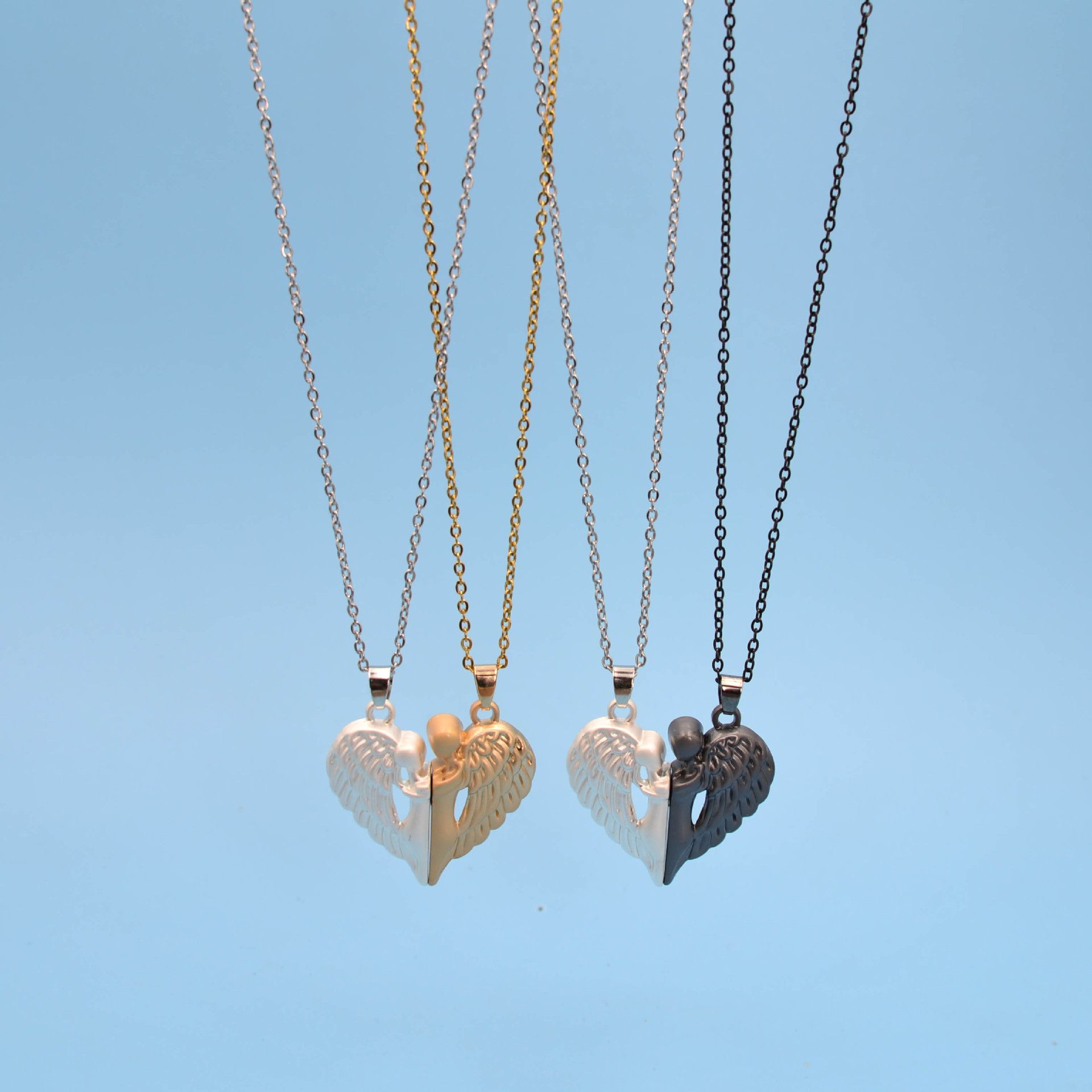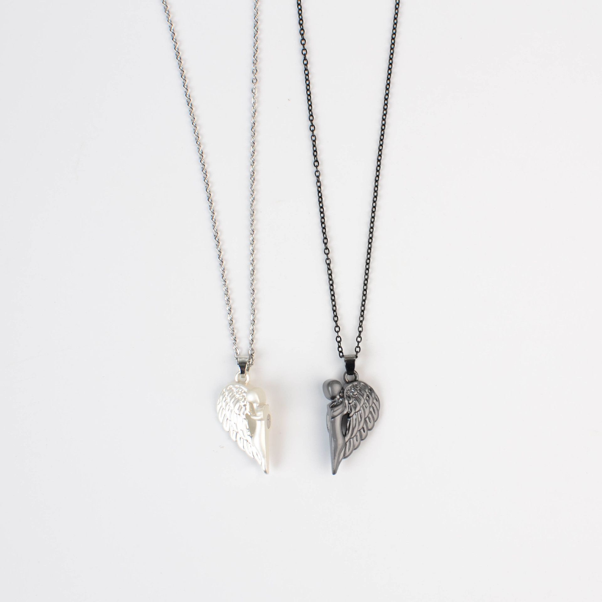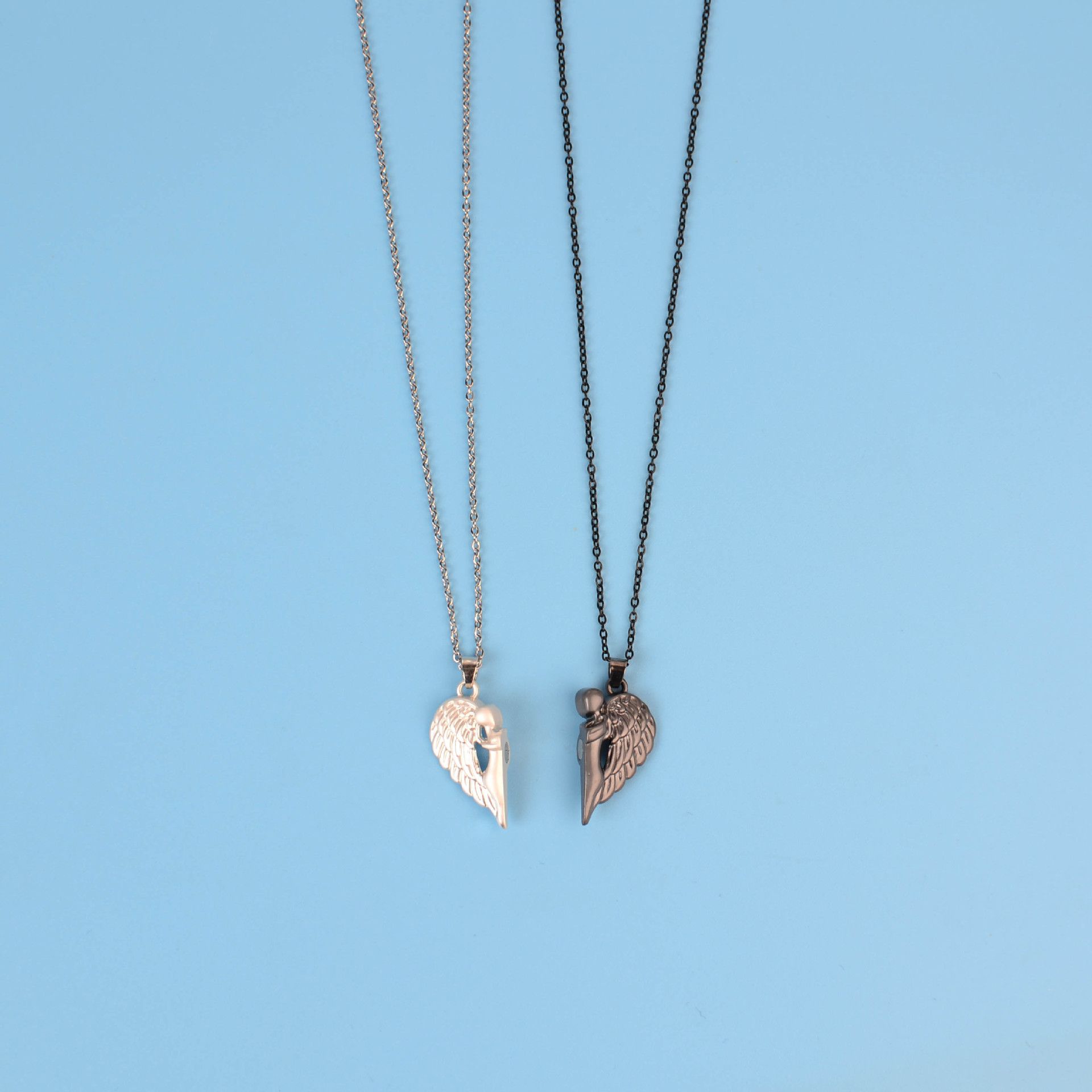 MATCHING SET DESIGN: Two separate necklaces featuring angel wing pendants that form a complete heart when brought together, symbolizing unity and connection between couples or best friends