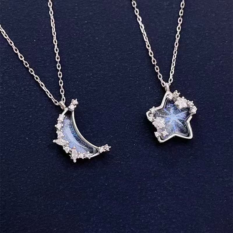Celestial Design: The moon pendant curves gracefully, adorned with marquise and round-cut CZ stones along its edge; the star pendant mirrors the ethereal blue crystal, framed with tiny star-shaped CZ accents—perfect for matching with your partner.