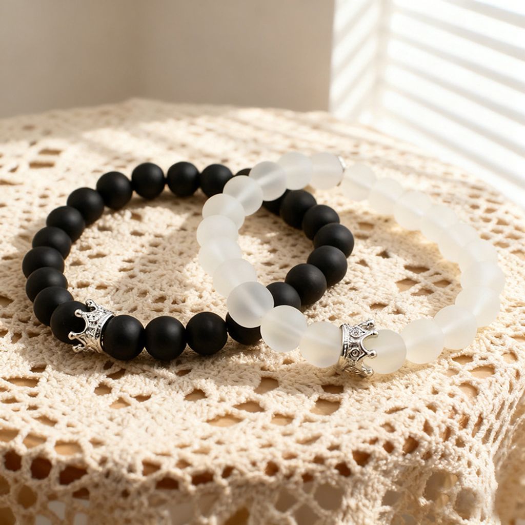 - Elegant Crown Charms: The white frosted bead bracelet is adorned with a gold crown (for her), while the black matte bead bracelet has a silver crown (for him)—a playful nod to your "King and Queen" status.
