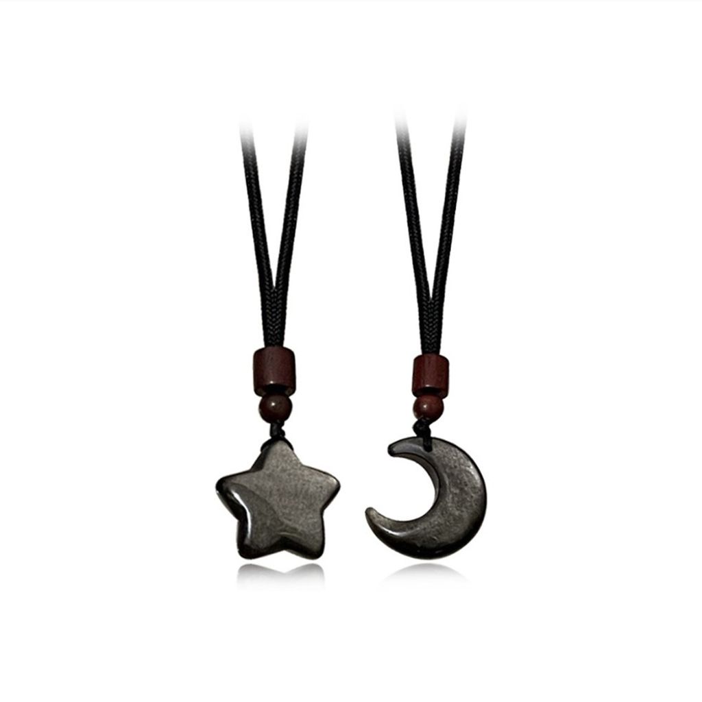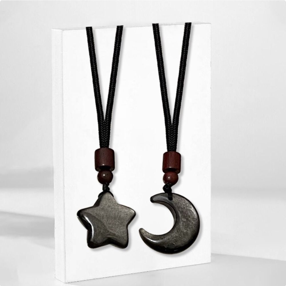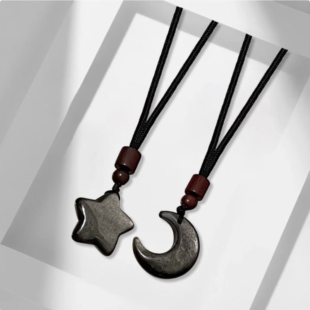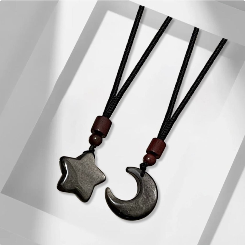 This Star & Moon Matching Couple Necklace Set is crafted from natural silver sheen obsidian, symbolizing the eternal bond between two souls. Each piece features a smooth, polished star or moon pendant paired with rich wooden beads on a durable black cord, creating a minimalist yet meaningful design perfect for everyday wear.