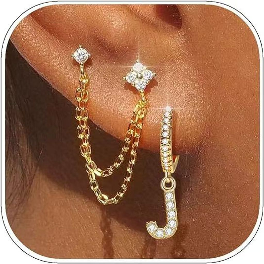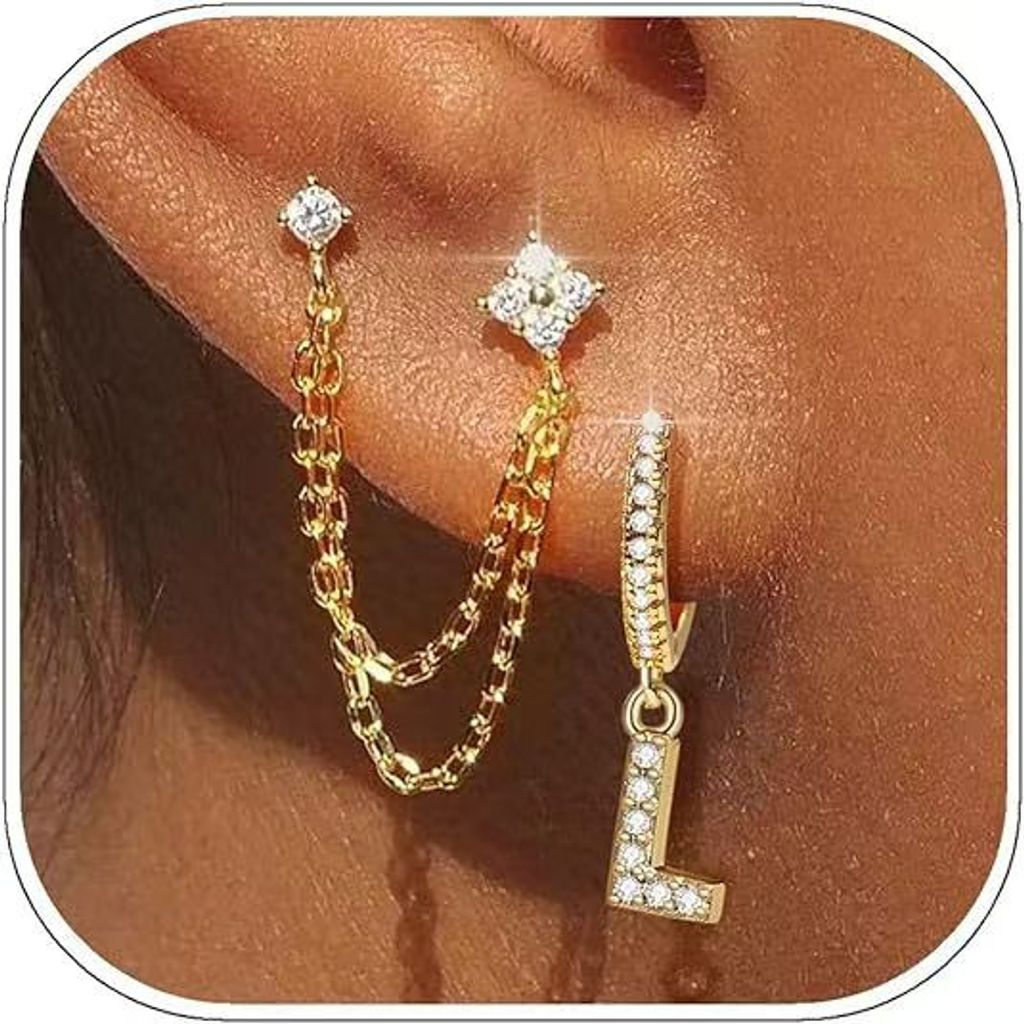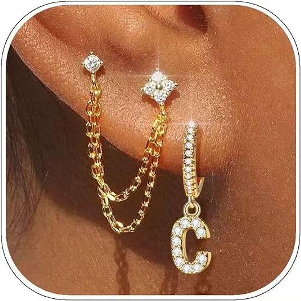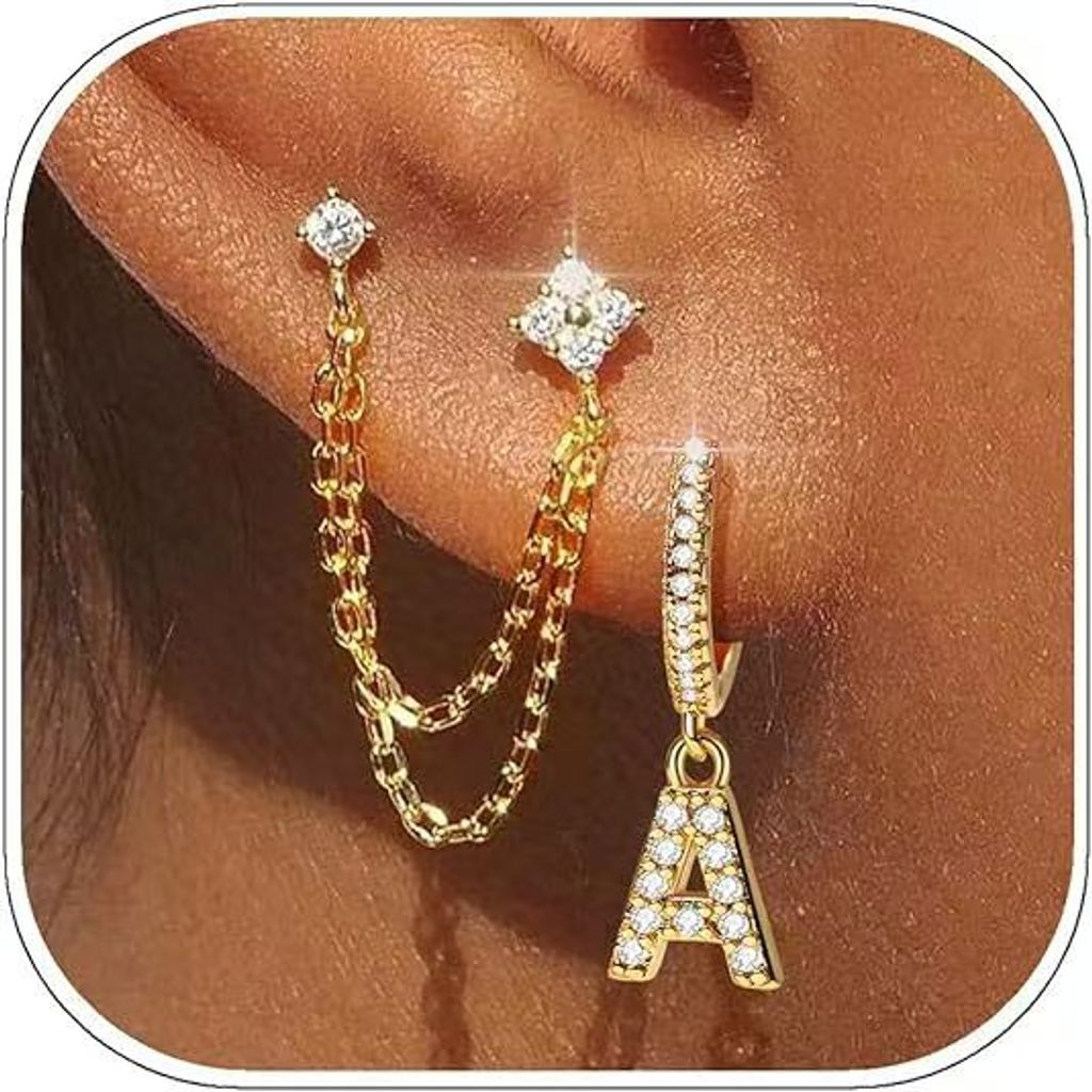 Dainty Gold Chain Alphabet Earrings Versatile Set: Includes double chain earrings, sparkling cubic zirconia studs, and delicate chain dangle earrings. Mix and match styles for everyday elegance or layered looks.
