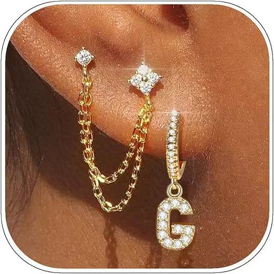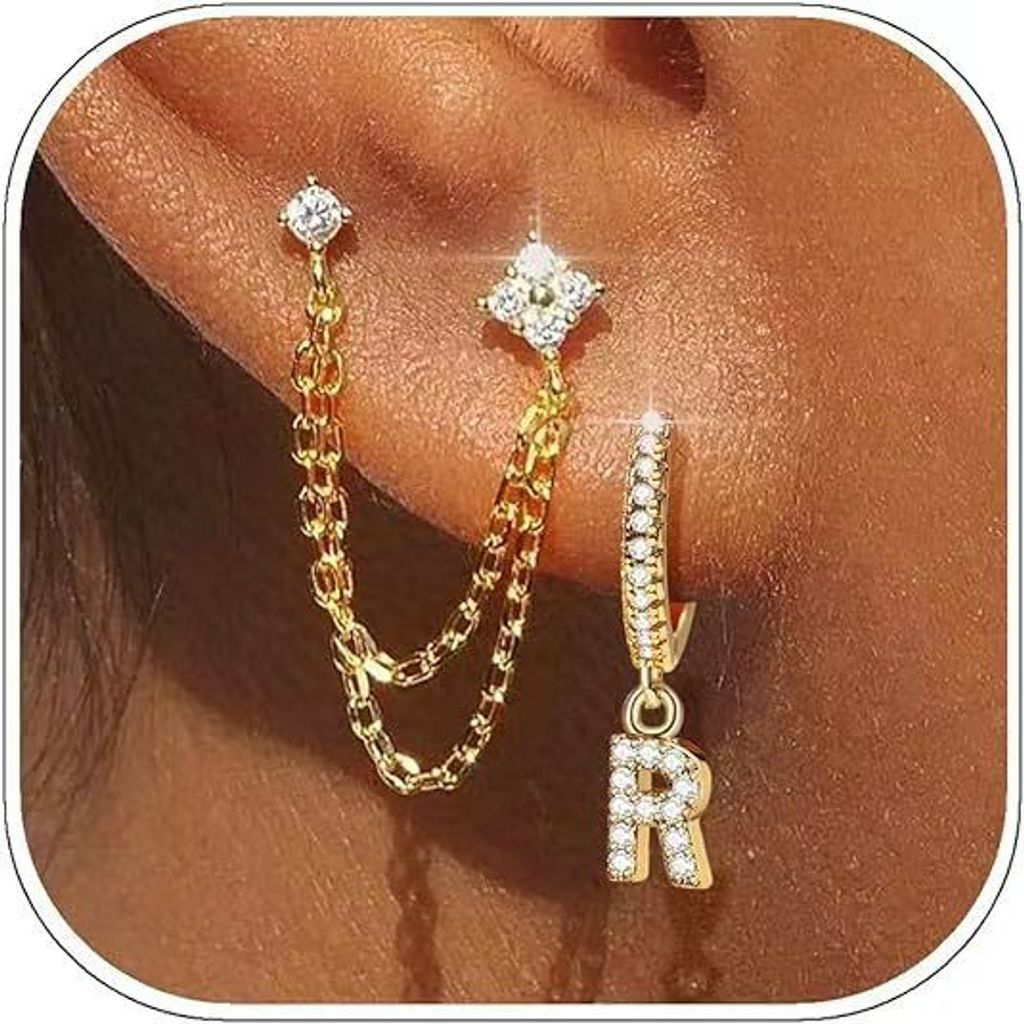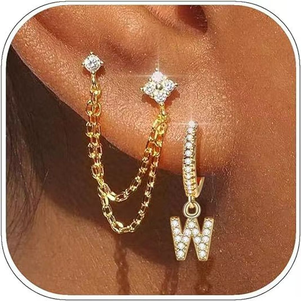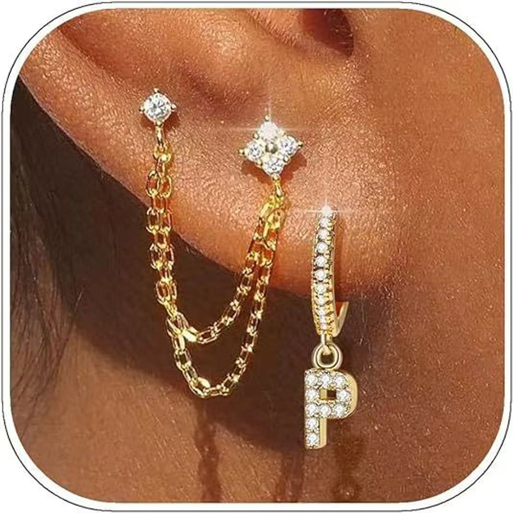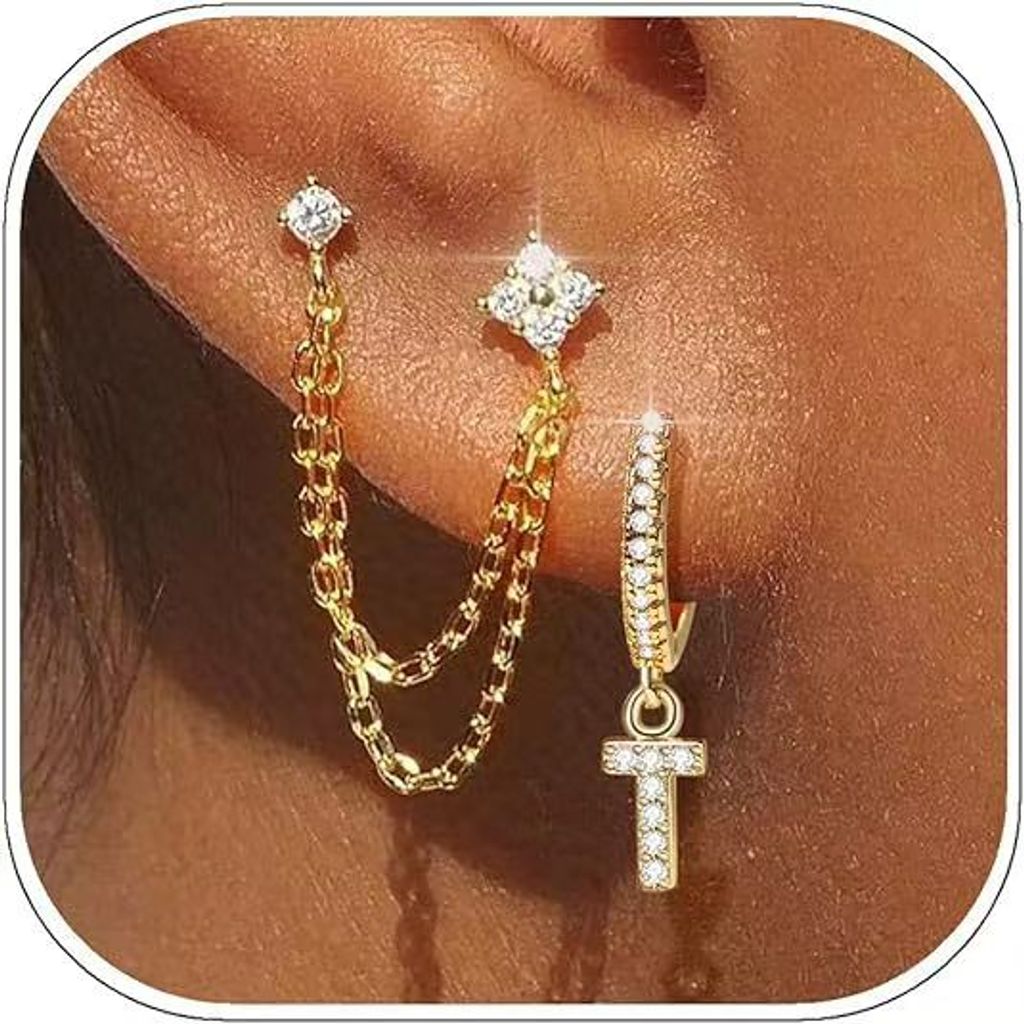 Dainty Gold Chain Alphabet Earrings Versatile Set: Includes double chain earrings, sparkling cubic zirconia studs, and delicate chain dangle earrings. Mix and match styles for everyday elegance or layered looks.
