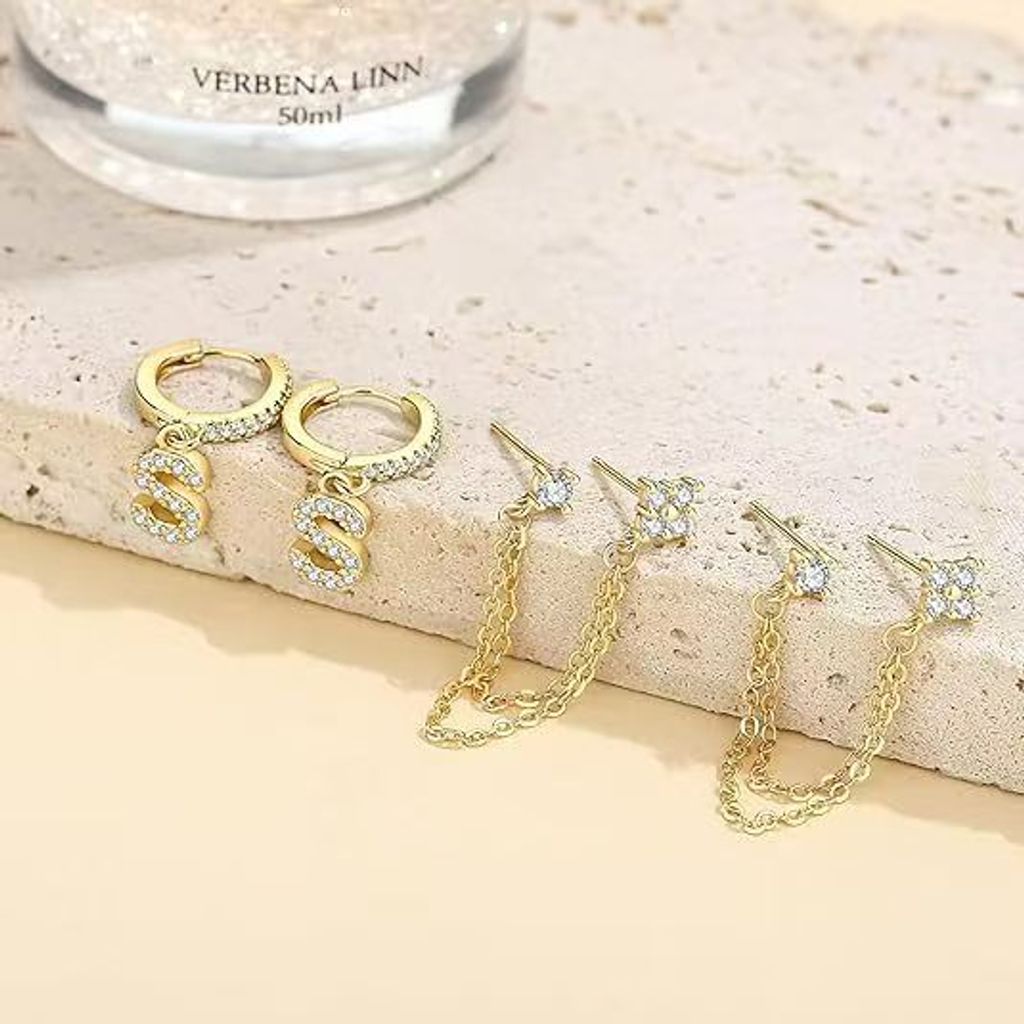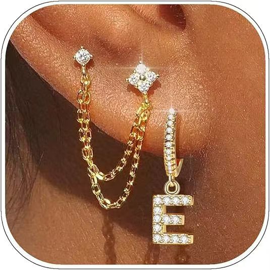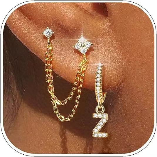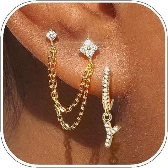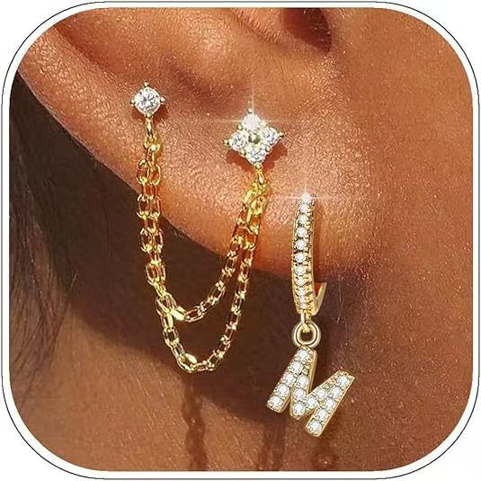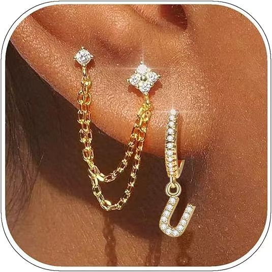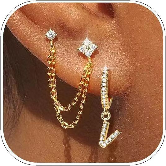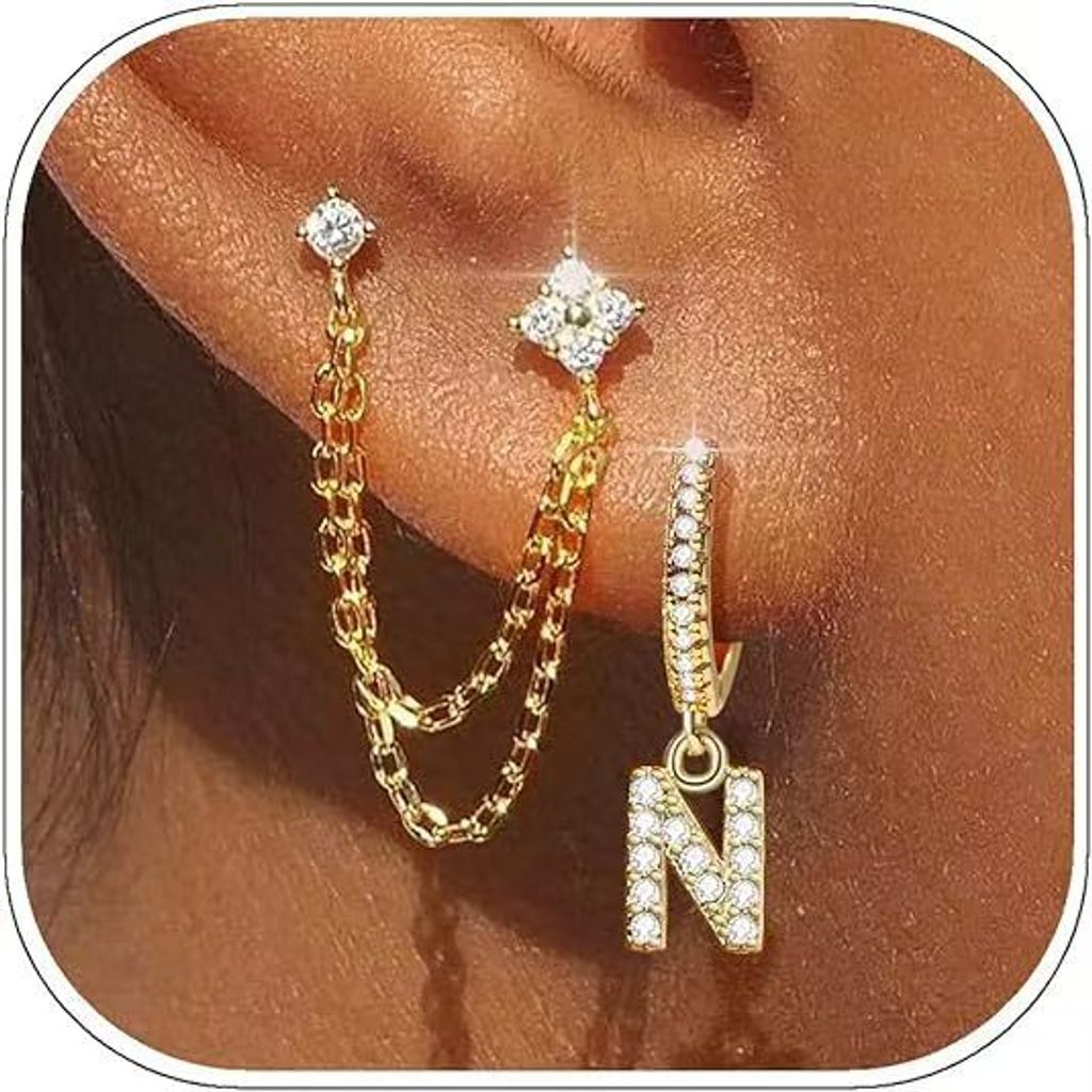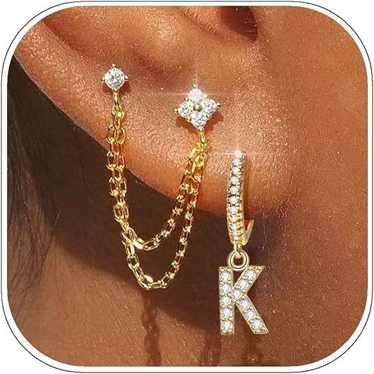 Dainty Gold Chain Alphabet Earrings Versatile Set: Includes double chain earrings, sparkling cubic zirconia studs, and delicate chain dangle earrings. Mix and match styles for everyday elegance or layered looks.
