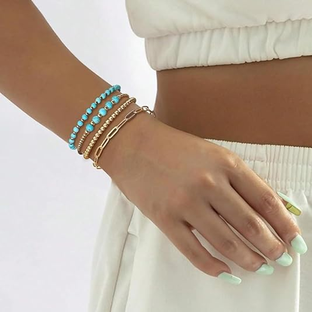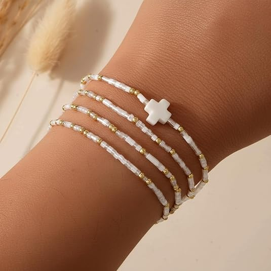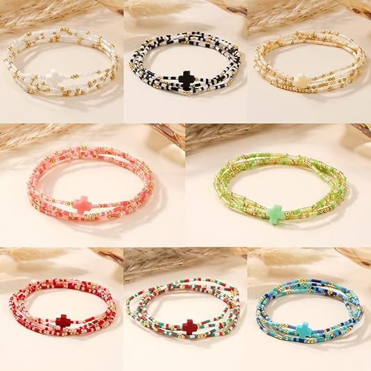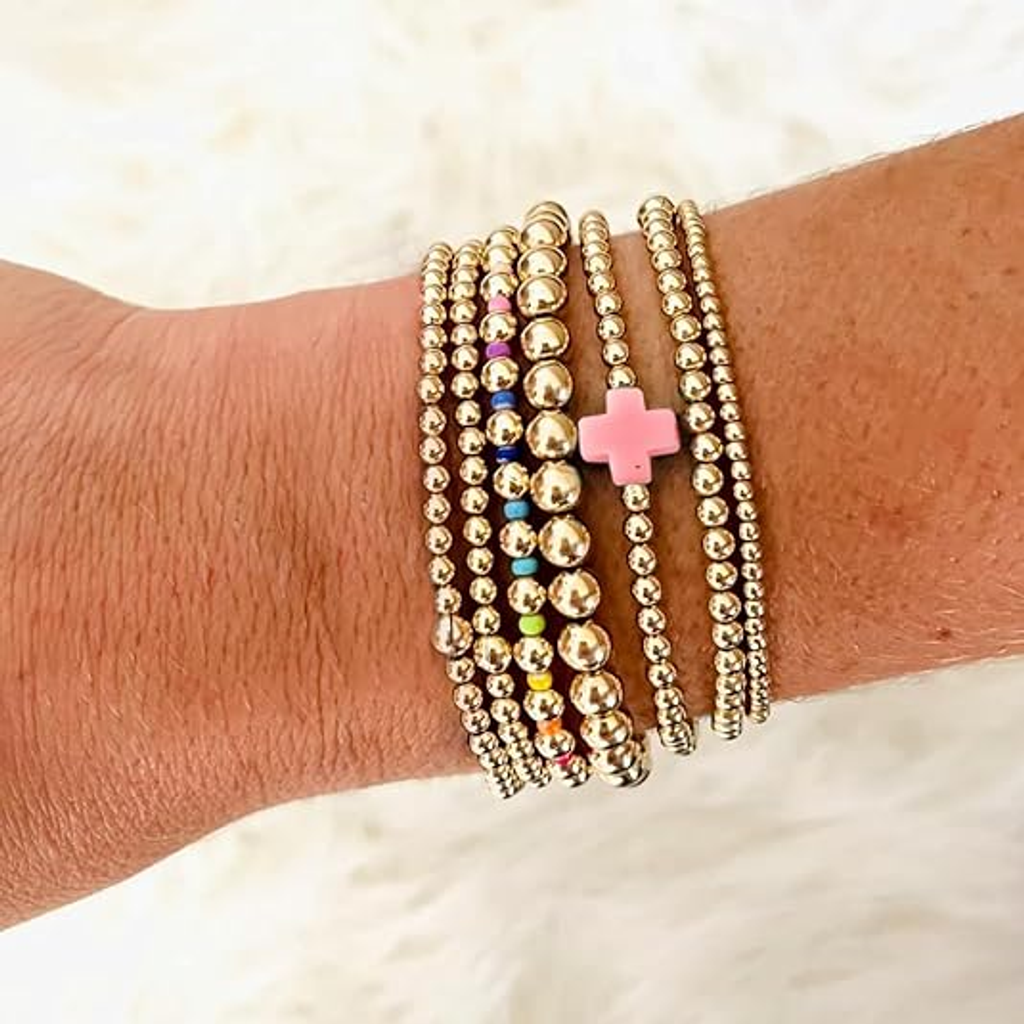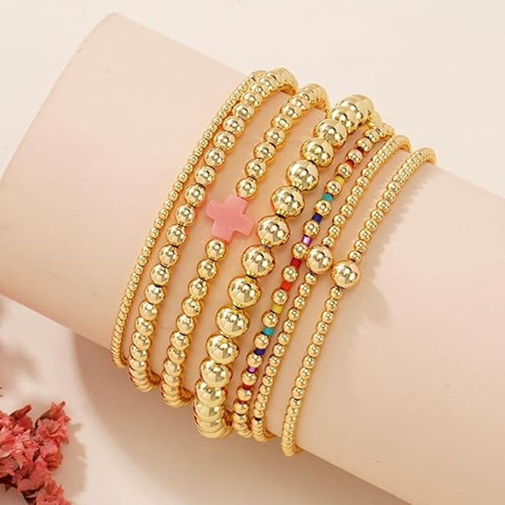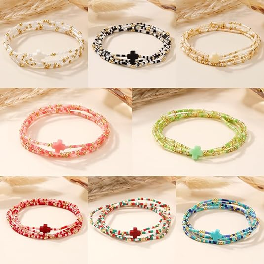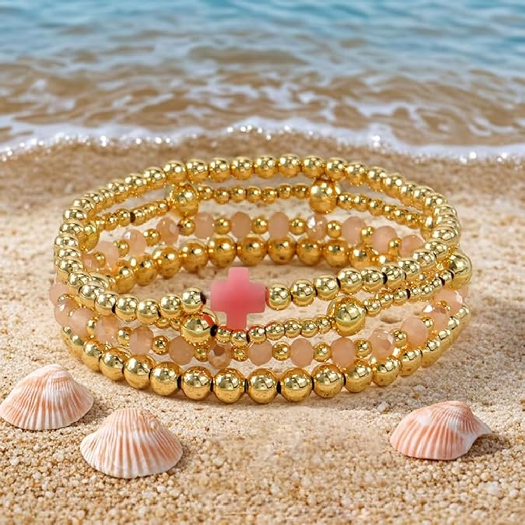 Gold Stacking Bracelet: This bracelet set features a cross pendant, gold beads, and colorful seed beads, creating a spiritual piece of jewelry. Each piece can be worn individually or stacked, perfect for everyday wear and special occasions.